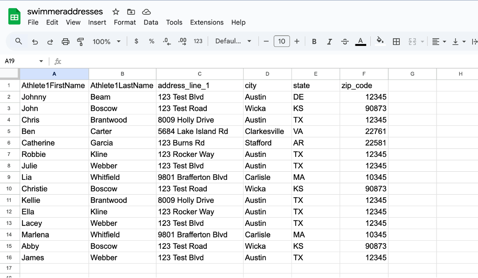 Step 2: Open the CSV with Google Sheets, and remove any columns and athletes you do not want, so that you are left with a list of the athletes in the meet, along with their addresses: