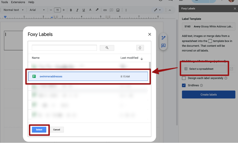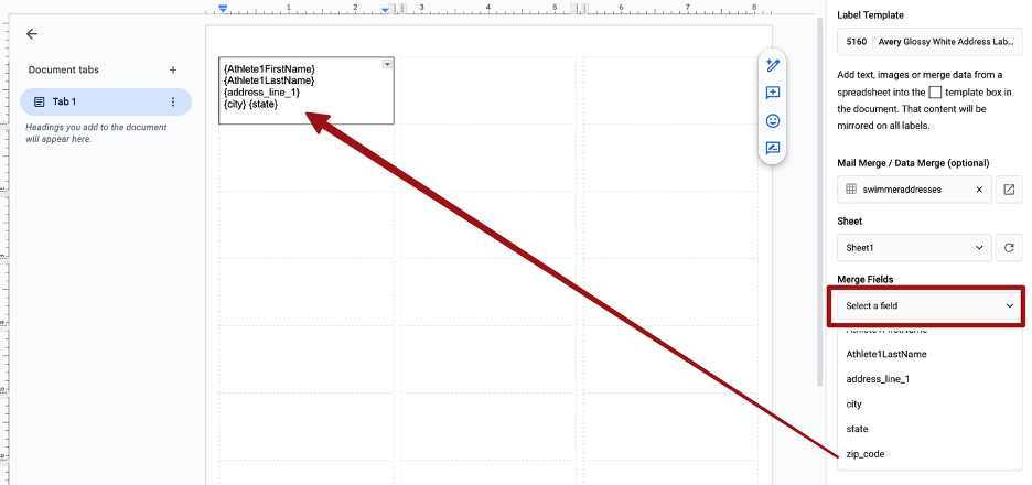 Step 6: Then, under the Mail Merge/Data Merge, choose the spreadsheet with your swimmer addresses: